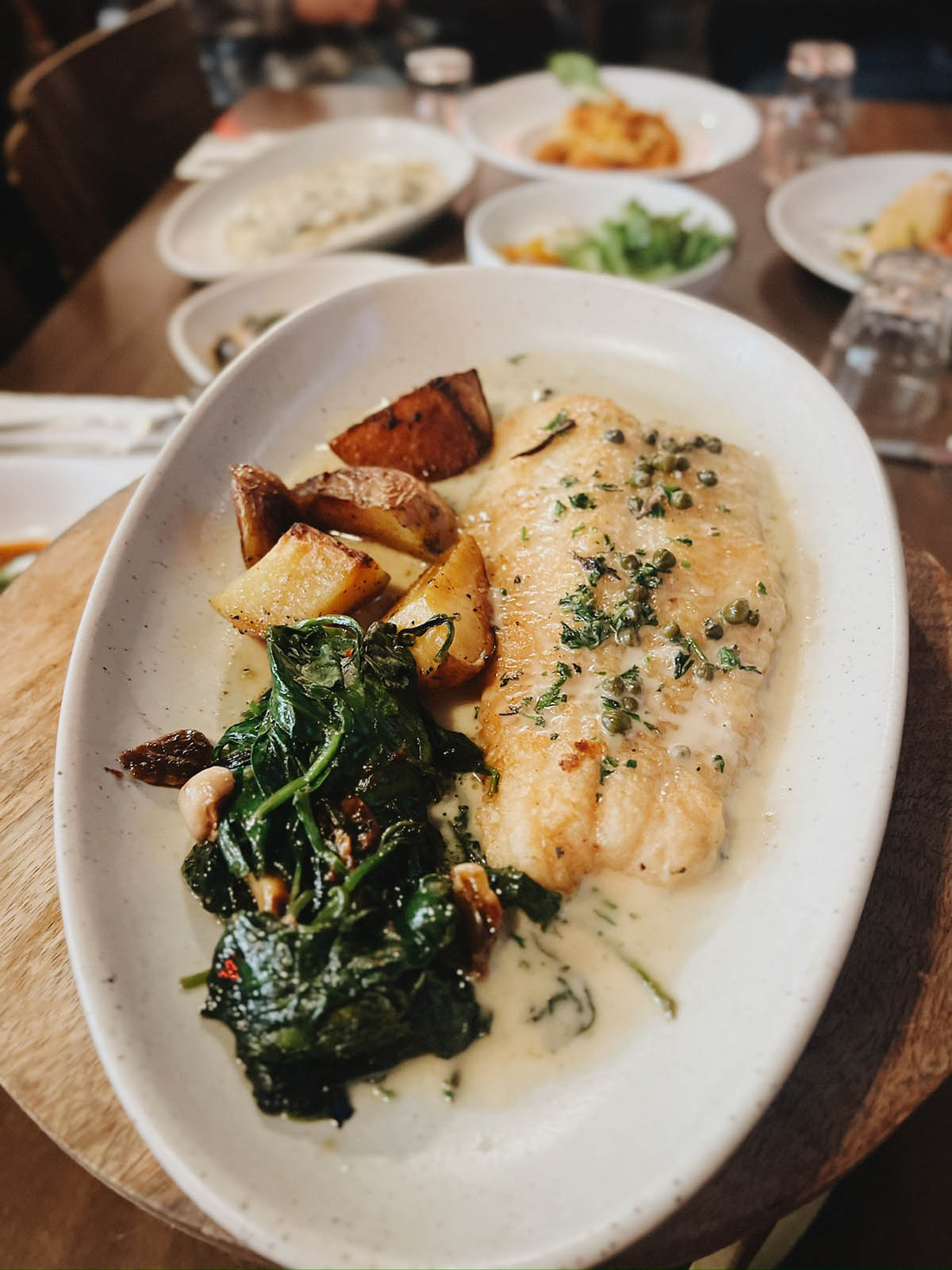Pan roasted chicken breast, lemon, white wine, capers sauce served with spinach and potato