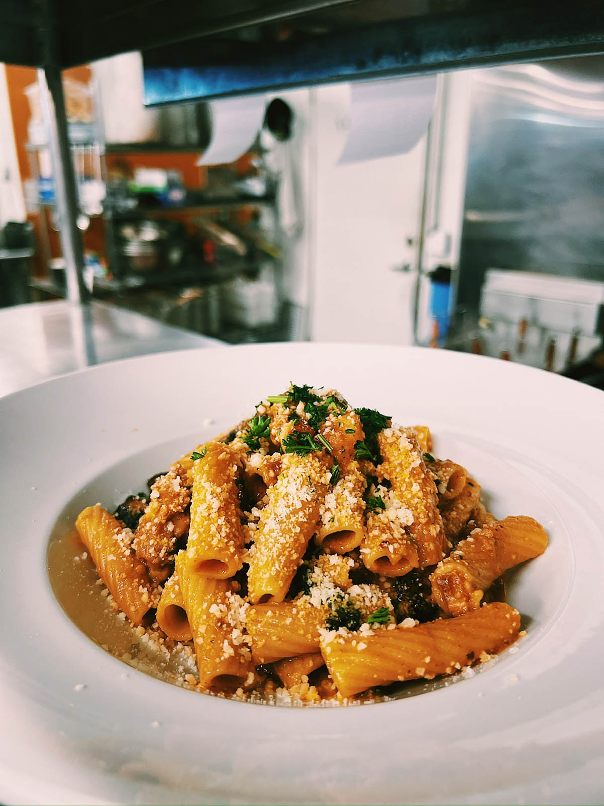 Breaded 6oz chicken breast, tomato sauce, mozzarella, side of rigatoni pink sauce.