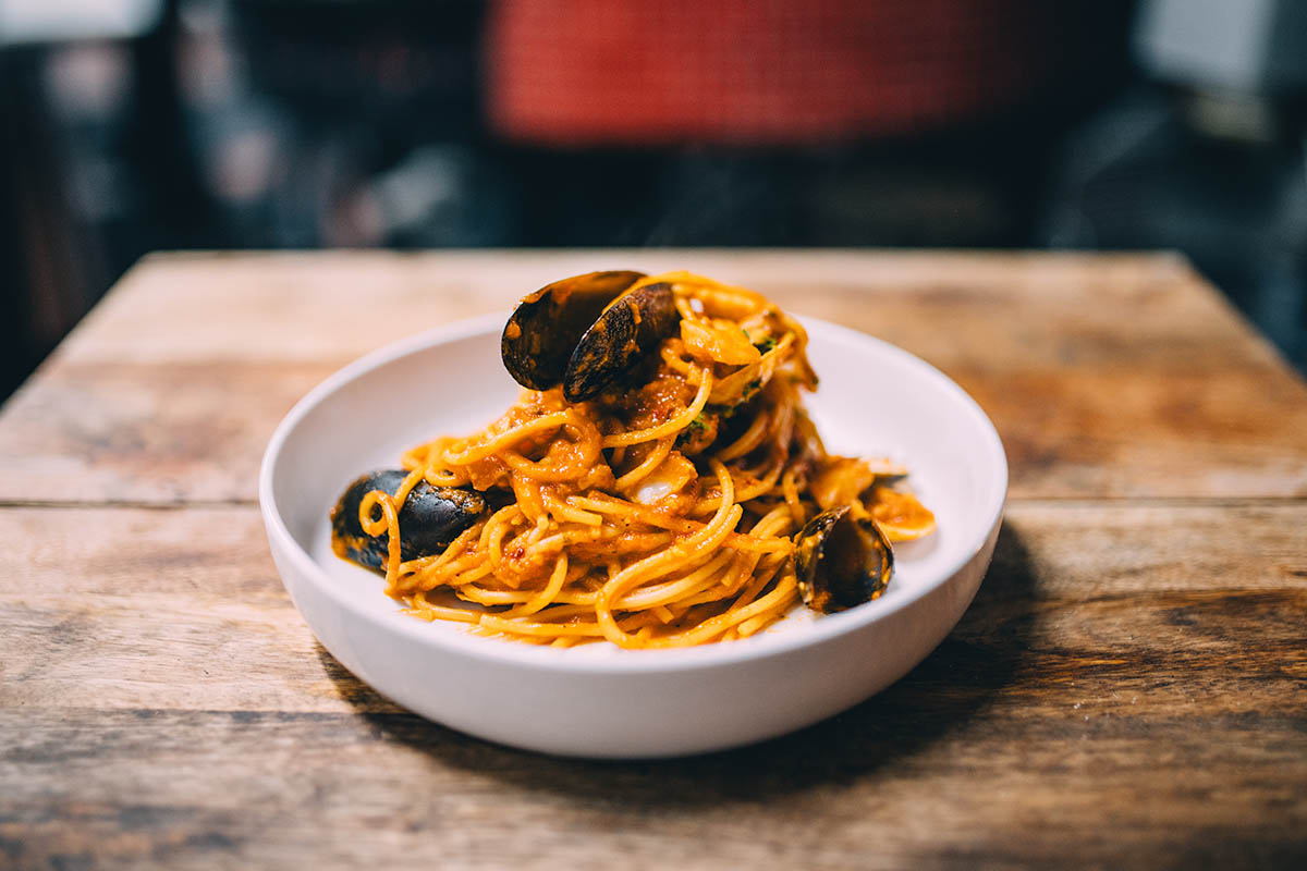 Spaghetti, mussels, clams, shrimps, white fish, calamari in tomato sauce.
